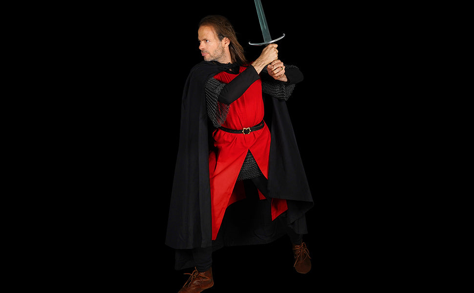 Designed with splits at the front, back, and sides, it offers excellent mobility and airflow, ideal for active use during reenactments, horseback riding, or long days at events. The flowing design creates a dynamic, commanding look that enhances your overall medieval presence.