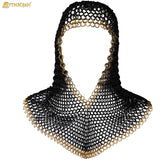 Mythrojan Medieval Chainmail Coif Butted Mild Steel and Solid Brass, Medieval SCA Reenactments Medieval Events, Black Finish with Solid Brass Edges, L