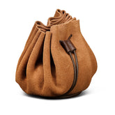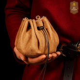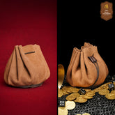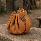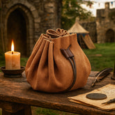 The bag secures with a leather cord drawstring, keeping coins, dice, or trinkets safe while still easy to access. Its rich suede texture adds a period-authentic touch, just the kind of pouch a merchant, gambler, or sorcerer might use.